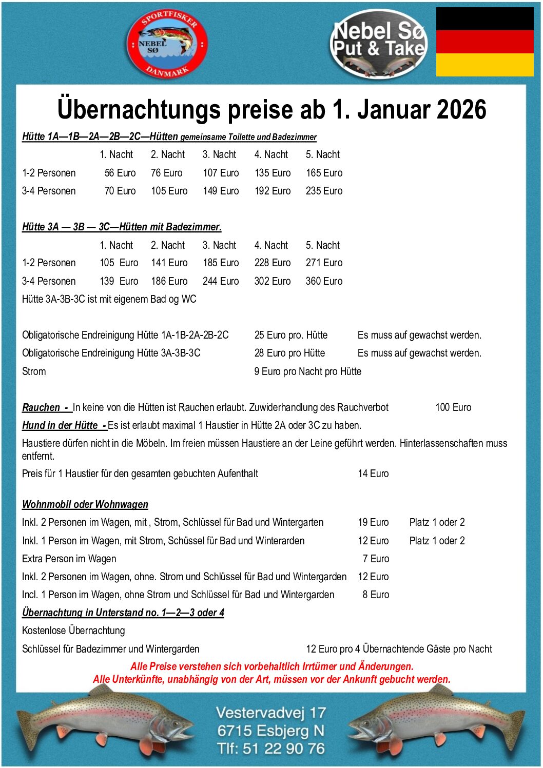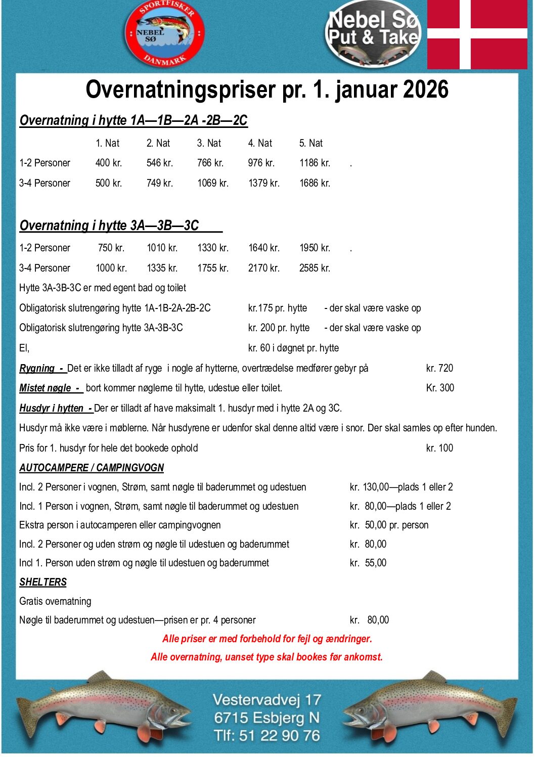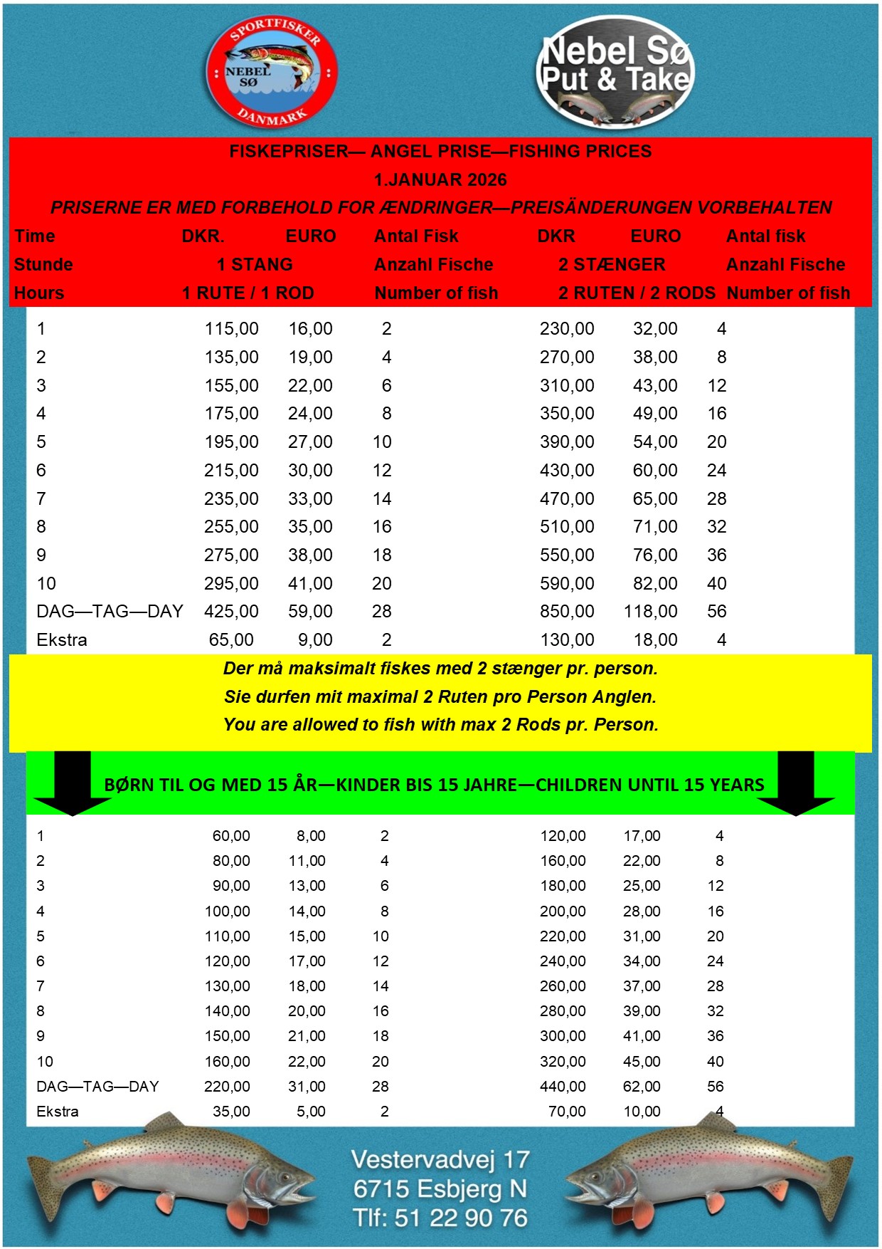 Nebel Sø består af 2 “put and take” søer, som er åbent dagligt og året rundt fra kl. 5 til kl. 23.